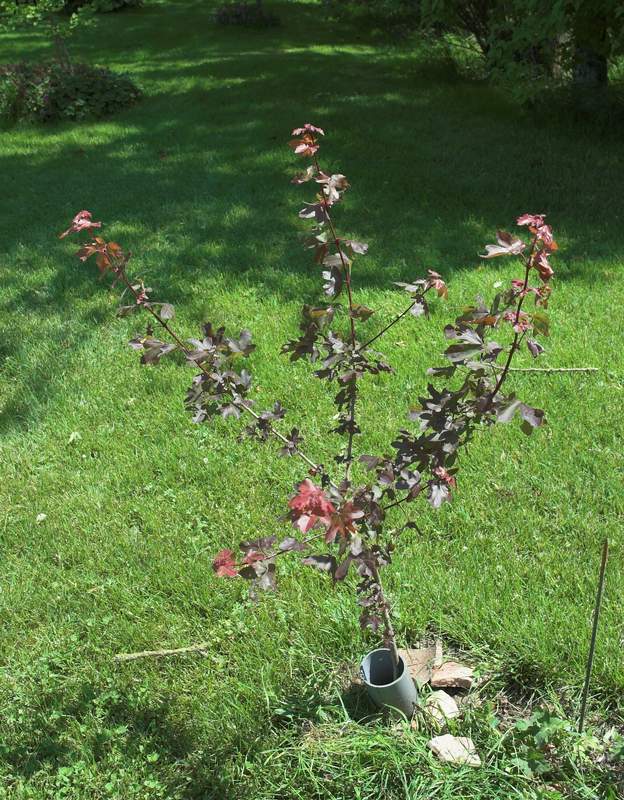 Nous avons trouvé vers 2009 un érable qui a poussé tout seul, très curieux parce qu'il a les jeunes feuilles toutes rouges